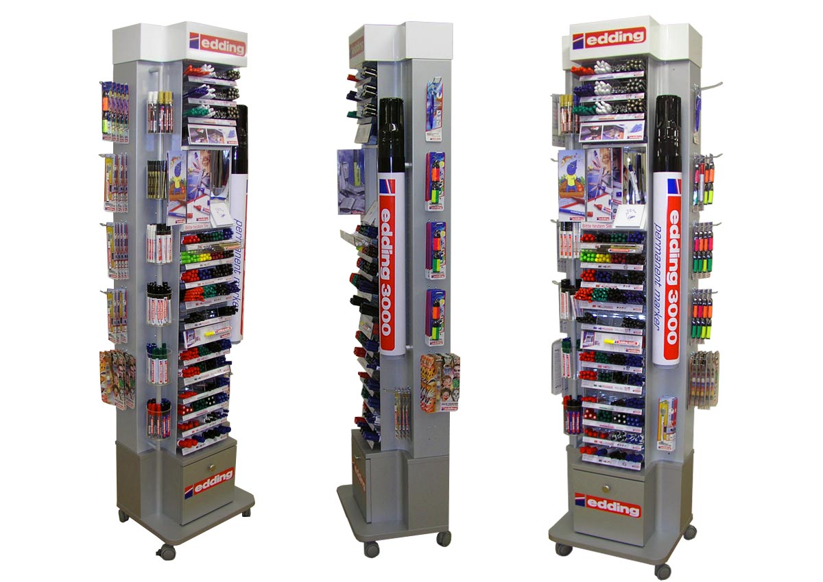 Free standing display units stand out in store so much because they break up the monotony of regular retail shelving.